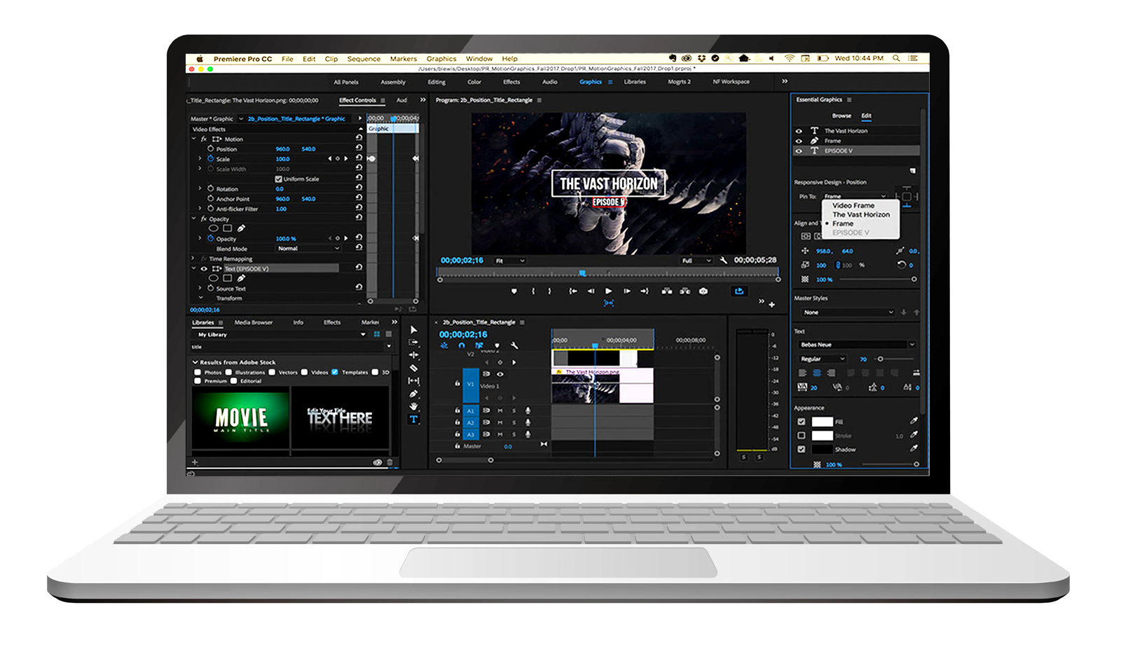 Premiere Pro works seamlessly with other apps and services, including Photoshop, After Effects, Adobe Audition and Adobe Stock. Open a Motion Graphics template from After Effects, customise one from Adobe Stock or integrate with hundreds of third-party extensions.